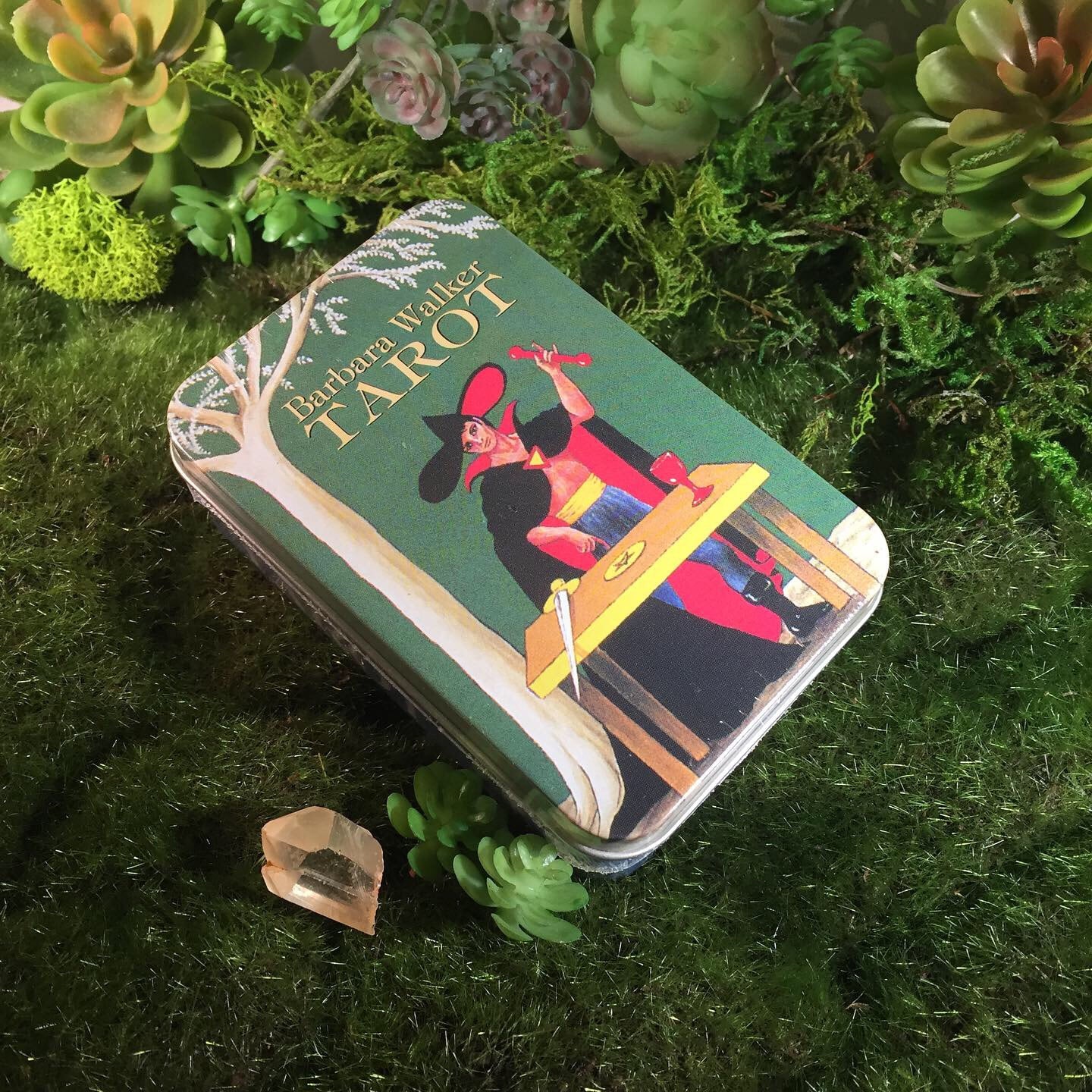 Barbara Walker Tarot reflects a unique feminist perspective of tarot with religious and pagan symbols from around the world. The Court Cards depict mythological gods and goddesses. The dominant colors of the deck and the card back design are red, black and white because they are “recognized everywhere as the colors of the original feminine Trinity (Triangle) representing her three phases of Virgin, Mother and Crone.” Includes 78 pocket-sized cards with keywords in English, and a 48-page booklet.