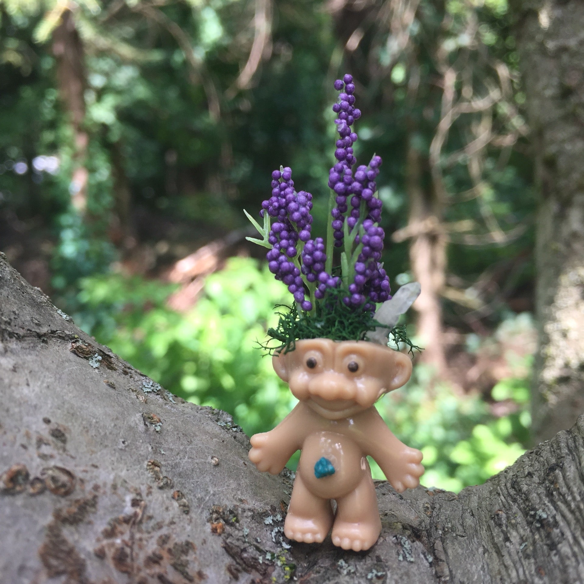 This mini crystal Troll has a sprigs of life like lavender blooming from its head! Its little belly is adorned with a natural Turquoise chip! Your new Troll friend comes with a little brith certificate and is ready to bring a wee bit of happiness into your life!