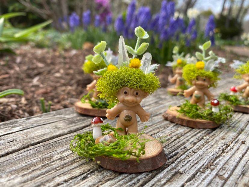Mini Crystal Trunk Trolls tend to their little gardens. Allowing the crystals, and mushrooms to grow upon the moss. Your new Troll friend comes with a little brith certificate and is ready to bring a wee bit of luck & happiness into your life!