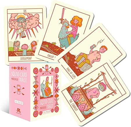 Filled with snails, cakes, fly-traps, and octopus, this deck is a modern and colorful twist on the traditional Tarot de Marseille. The Squid Cake Marseille is a seventy-eight-card deck in which you’ll discover knights riding creatures, quirky faces, and a delicious color palette! Bring a little lightheartedness to your readings while dishing out the cold hard truth . . . with a side of humor! Regardless of whether The Chariot is being pulled by two snails instead of horses or The Hierophant is giving advice to two pink birds rather than people, the message is still the same.