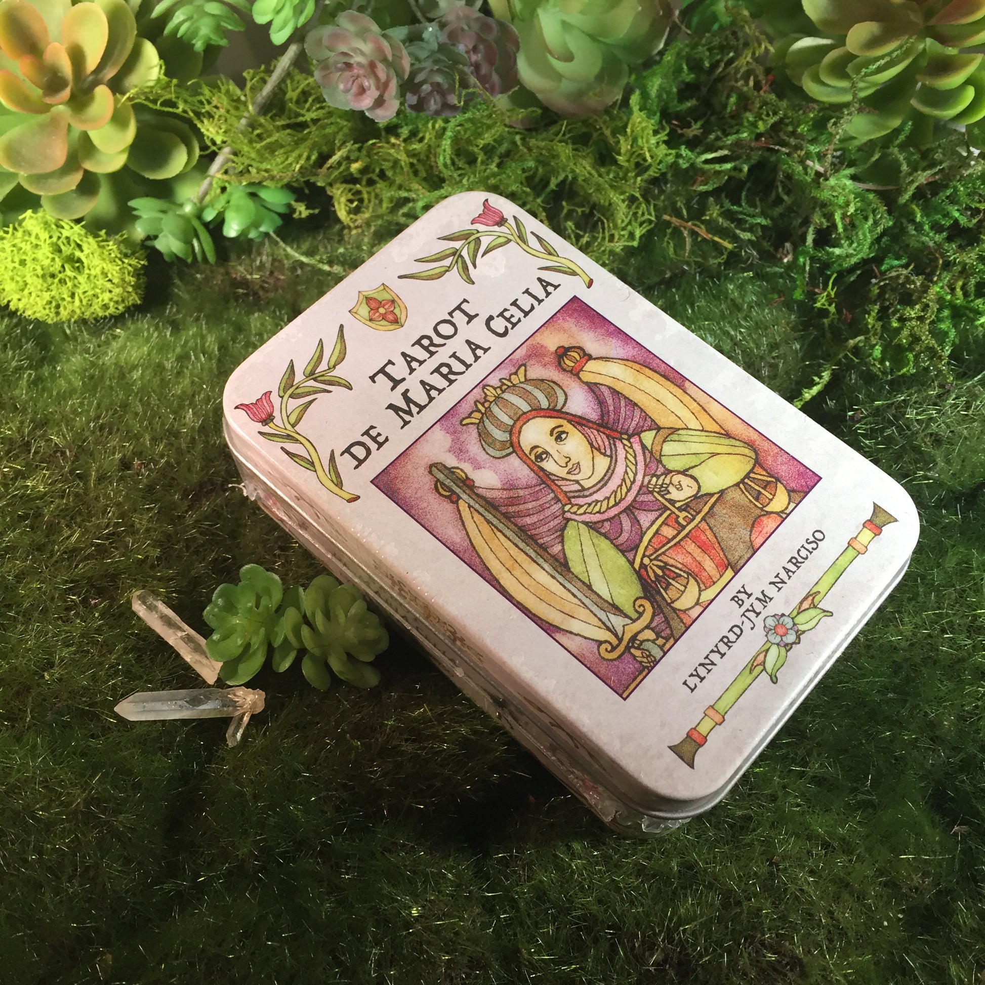 Popular tarot artist Lynyrd-Jym Narciso has focused his creative talents on modernizing Marseilles Tarot. Tarot de Maria Celia was inspired by several variants of the traditional Marseilles style yet brings its own uniquely charming features to this new deck. The card illustrations feature a fresh pastel color palette with “faux vintage” accents. In keeping with the European tradition, the card titles are presented in French. This pocket sized 80-card deck in a tin comes with a 56-page instruction booklet.