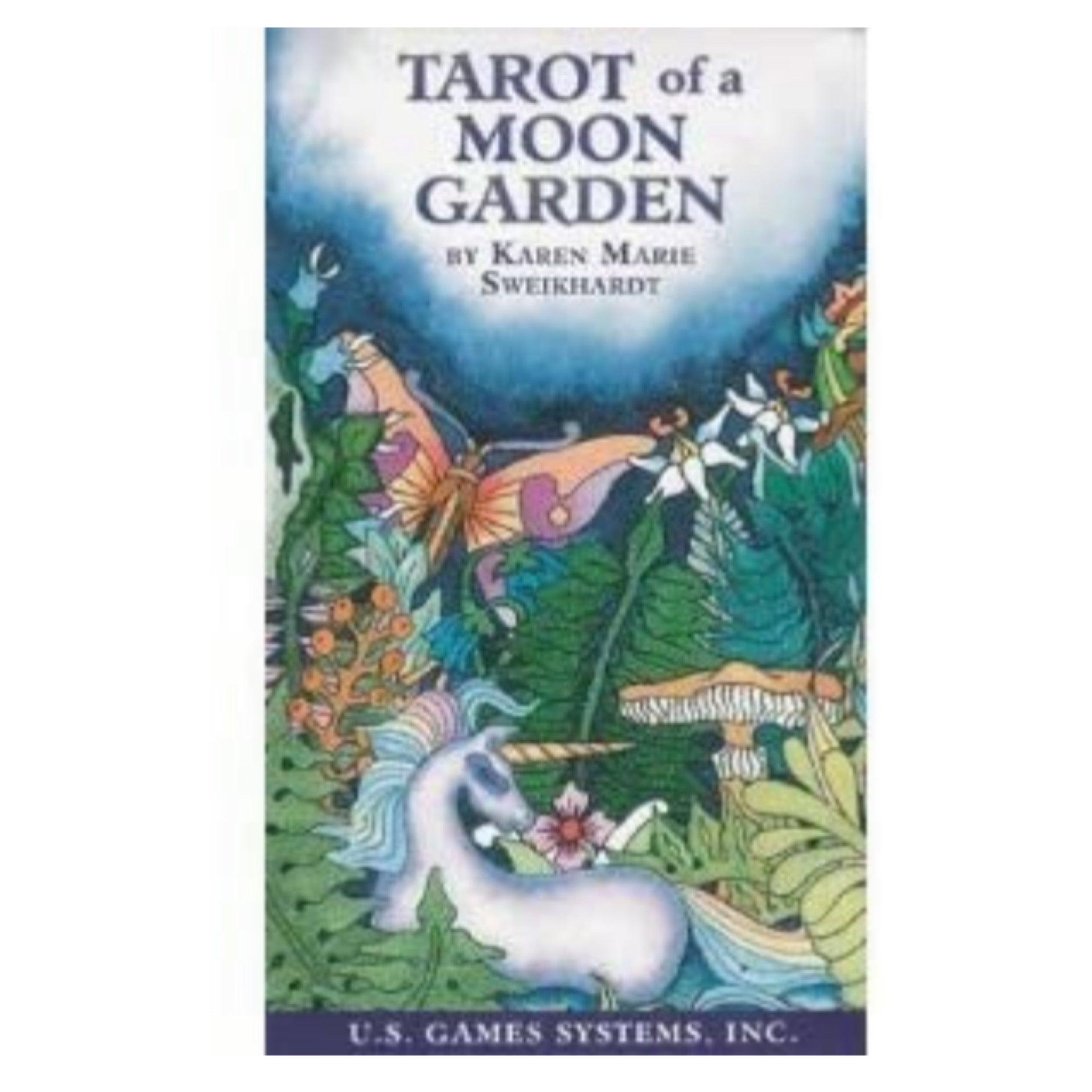 TAROT OF A MOON GARDEN The imaginative art of Karen Marie Sweikhardt weaves traditional tarot symbolism, mythic,expression, elemental magic, and reflective phases of lunar energy into a tapestried focusfor seer and seer alike. Each card in this deck measure 2 3/4 x 4 3/4".