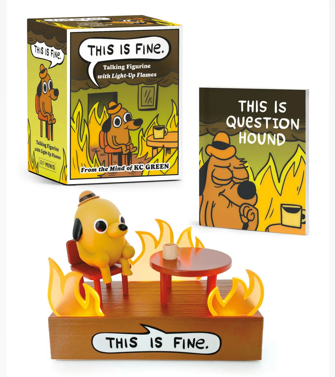 - Sound Element: Features audio of Question Hound uttering the iconic phrase “This is fine,” along with the sound of the crackling fire