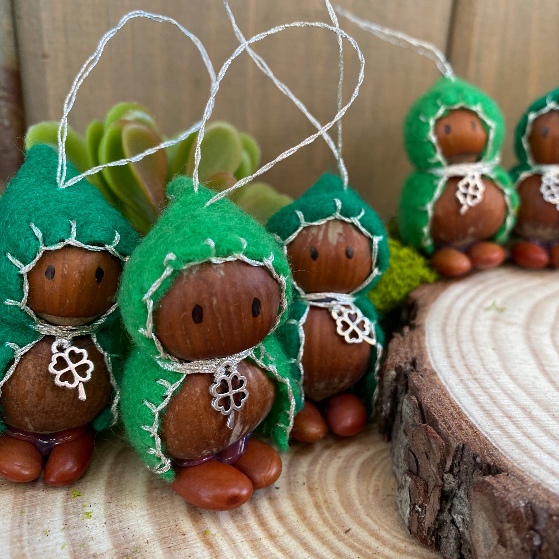 These tiny hand made Hazelnut Folk are adorned with a four leaf clover. Bring a wee bit of luck and whimsy into your life with one of these little friends.