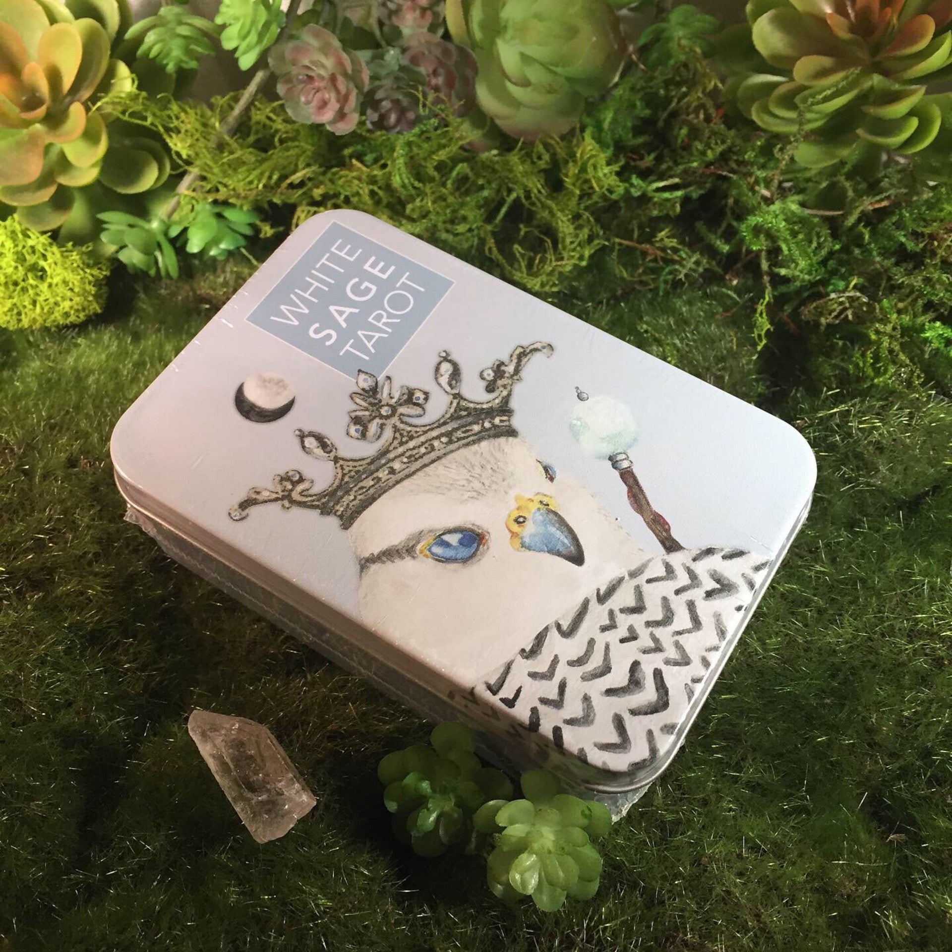 Inspired by ancient healing traditions this charming tarot deck features endearing animals in the Court Cards, chakra colors in the Minors, and natural elements throughout. The 78 cards balance masculine and feminine energy with modern minimalist art rendered in a soft pastel palette. White Sage Tarot helps people find clarity and flow along the journey of life. Includes 78 pocket-sized cards in a tin, 64-page booklet and chakra chart.